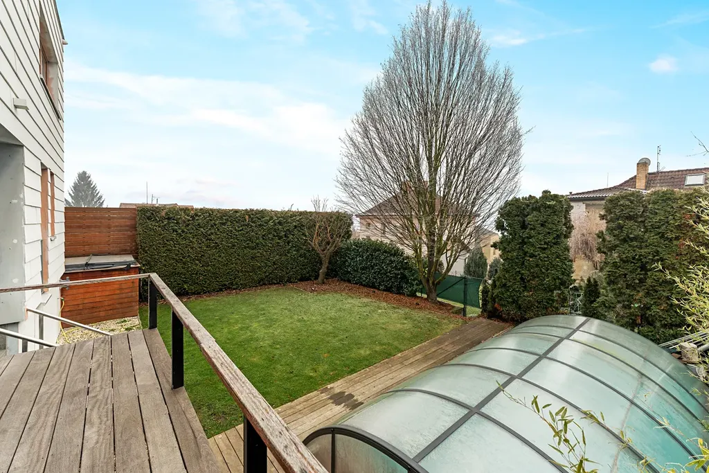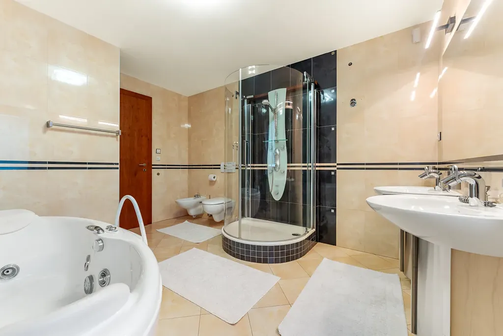 Interiér je promyšlen do posledního detailu. Dispozice 6+kk zahrnuje prostorný obývací pokoj s kuchyní a jídelnou, dvě velkorysé ložnice, dvě pracovny, šatnu, dvě koupelny, samostatnou toaletu a vstupní halu. Příjemná je i zimní zahrada s přímým vstupem do soukromé vířivky – místo, kde si můžete dopřát odpočinek v naprostém klidu.