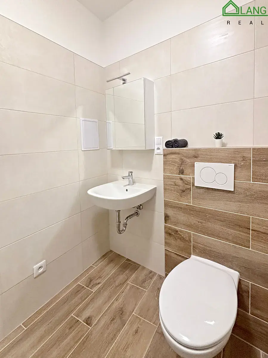 Koupelna disponuje sprchovým koutem, toaletou, umyvadlem se zrcadlovou skříňkou a pračkou. Celý interiér působí světlým a moderním dojmem a nabízí prakticky řešený prostor pro pohodlné užívání.