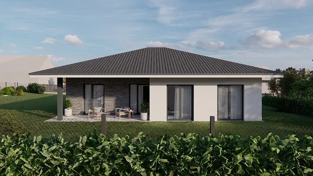 Cena kompletně dokončeného domu (bez kuchyňské linky), včetně zámkové dlažby, úpravy pozemku a oplocení, venkovních žaluzií.