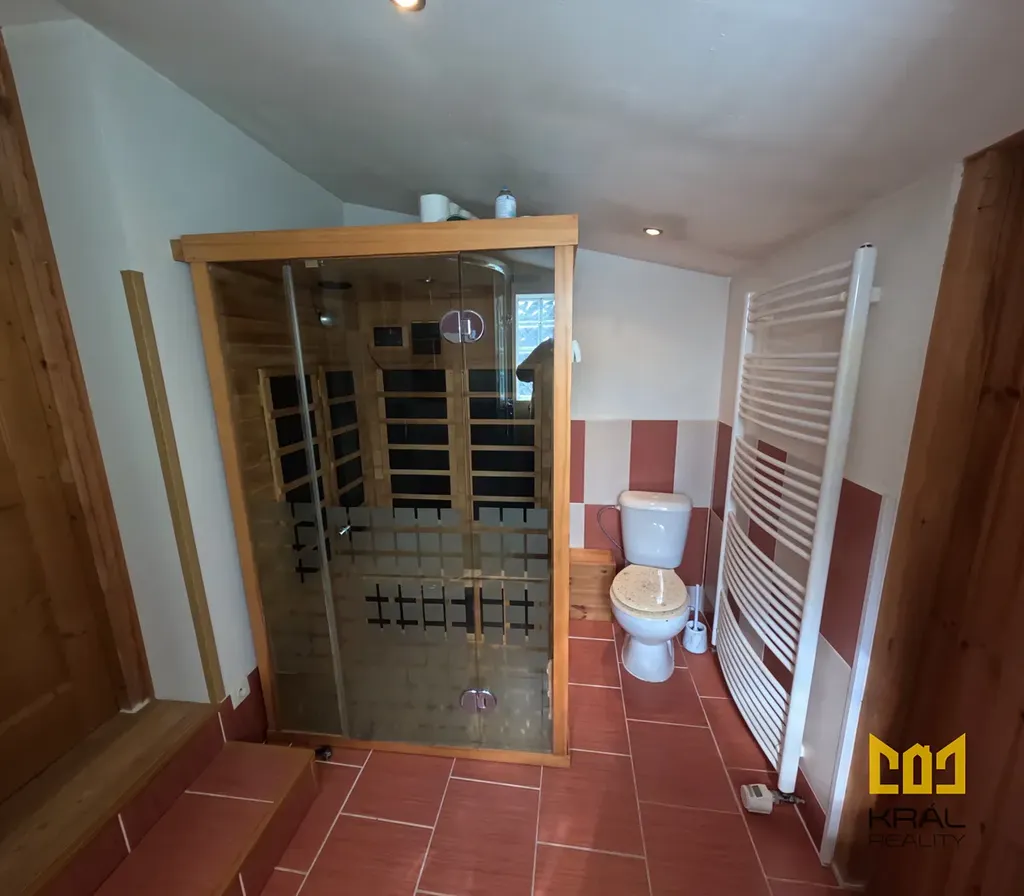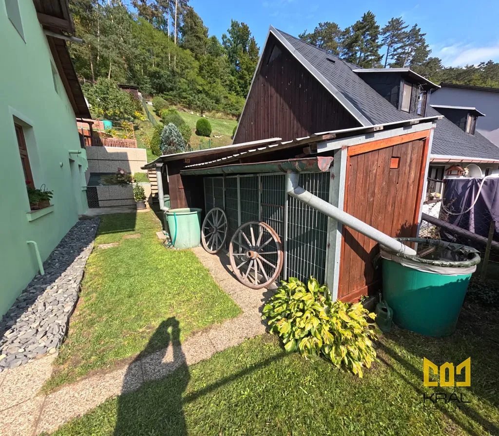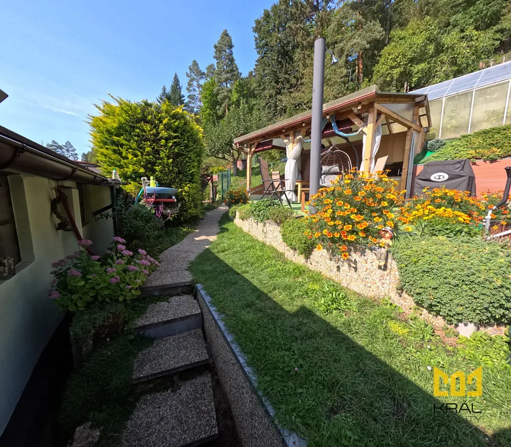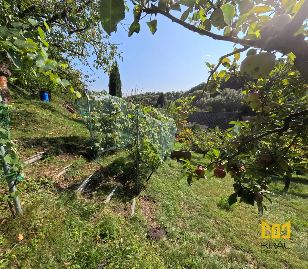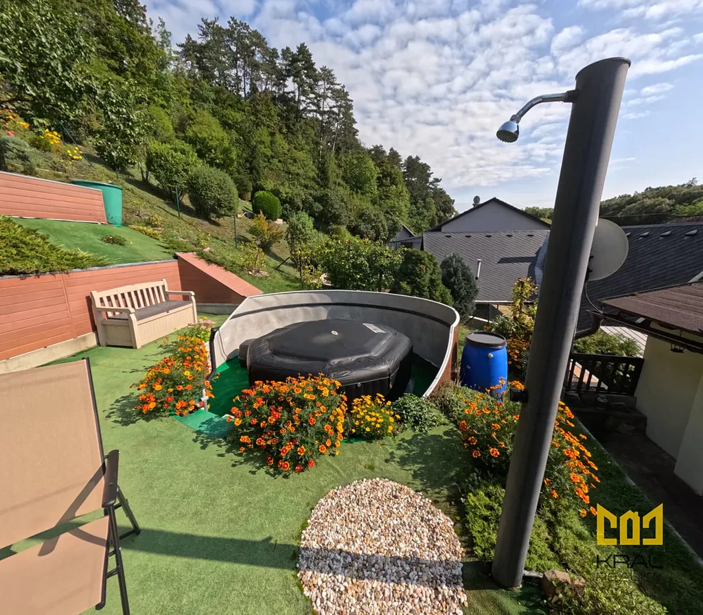 K domu náleží velice udržovaná zahrada s malým vinohradem, skleníkem, spoustu záhonů, okrasnou skalkou, relaxační zónou s vířivkou pro šest osob. Dominantou zahrady je prostorná zastřešená pergola, která budoucímu majiteli zajistí příjemné posezení a krásný výhled do krajiny. Dále je zajímavostí a výhodou vlastní kus lesa do kterého je přístup přímo z konce zahrady.
