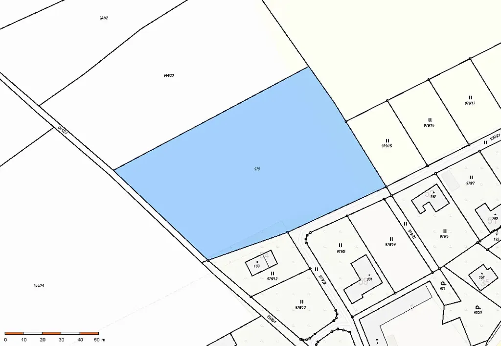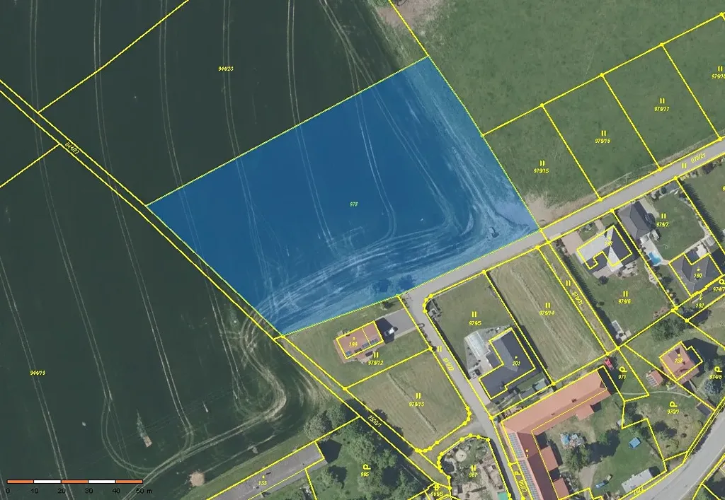 Předmětem veřejné dražby elektronické je pozemek parc. č. 978, orná půda, o celkové výměře 7 909 m2. Dle územního plánu je větší polovina pozemku s výměrou 3 989 m2 regulovaná jako navrhovaná zastavitelná plocha Br1 s využitím pro bydlení v rodinných domech - venkovské, zbylá část pozemku o výměře cca 3 920 m2 je územním plánem regulovaná jako plocha zemědělská.