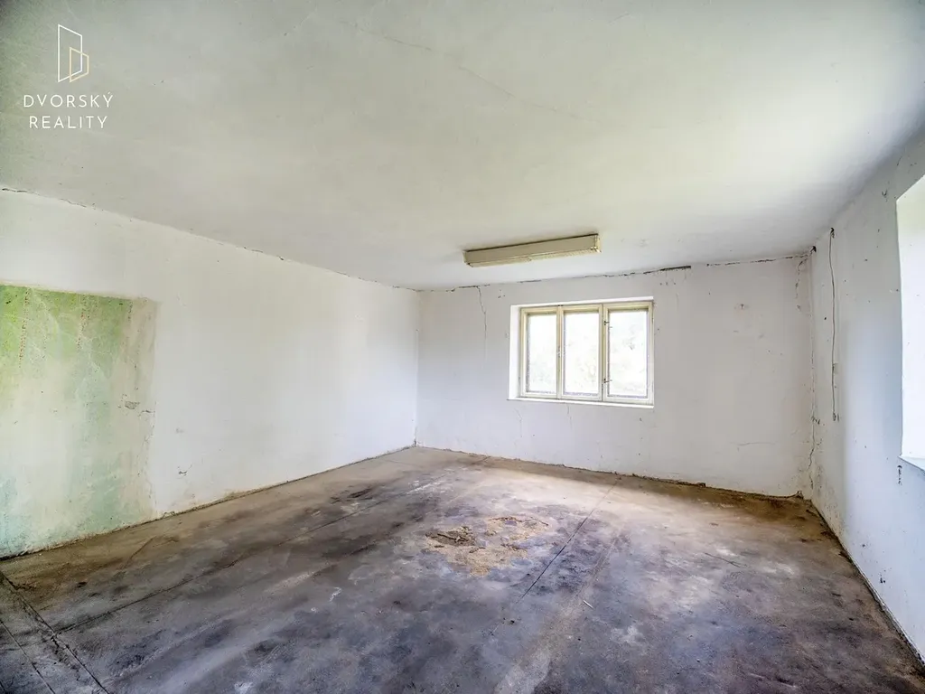 Obytná část je menší (dvě větší a jedna menší místnost), zato hospodářské prostory jsou opravdu rozsáhlé – ideální pro přestavbu na dílnu, ateliér nebo sklad.