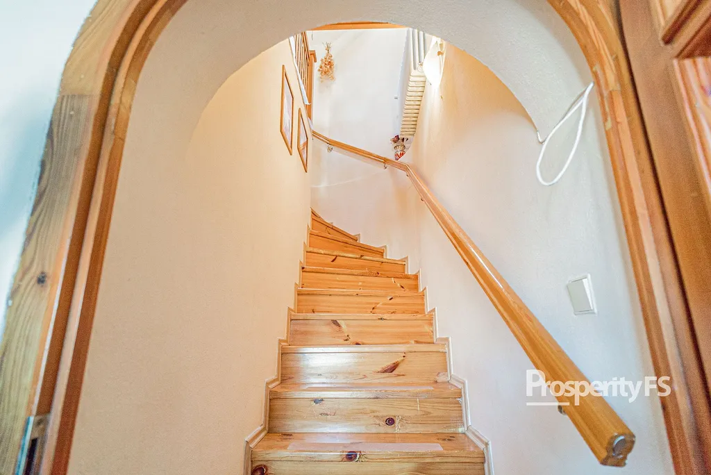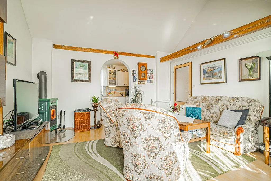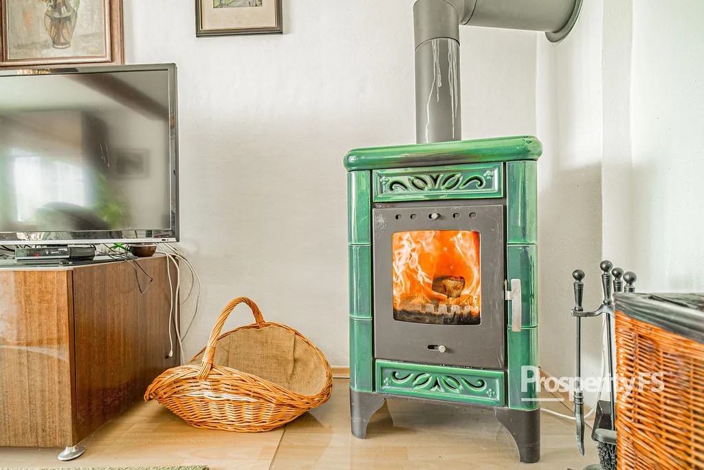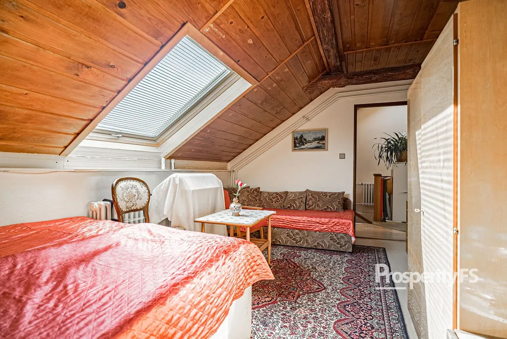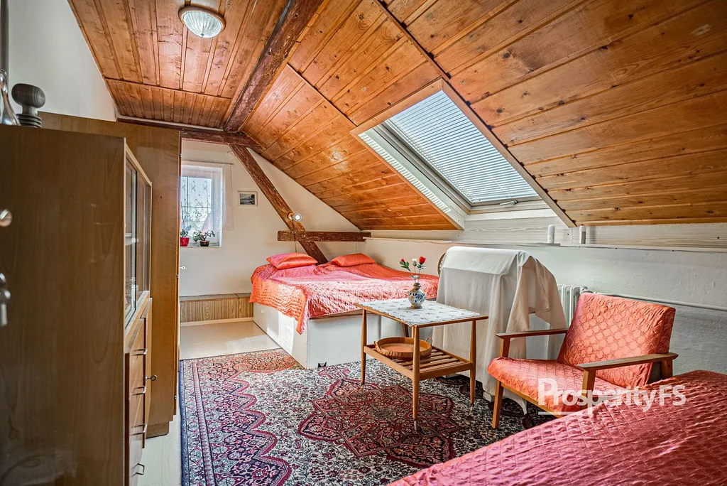 V patře najdete bytovou jednotku 3+1 s velkým obývacím pokojem vybaveným kamny a balkonem, dvěma neprůchozími prostornými ložnicemi, kuchyní, samostatnou koupelnou a WC.