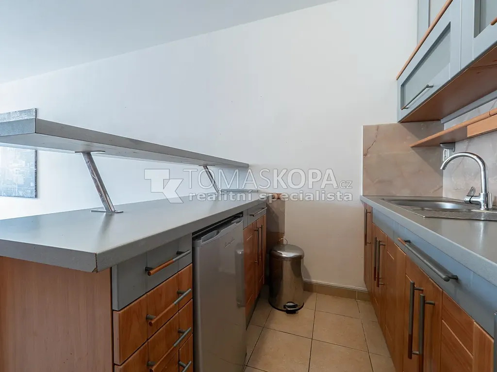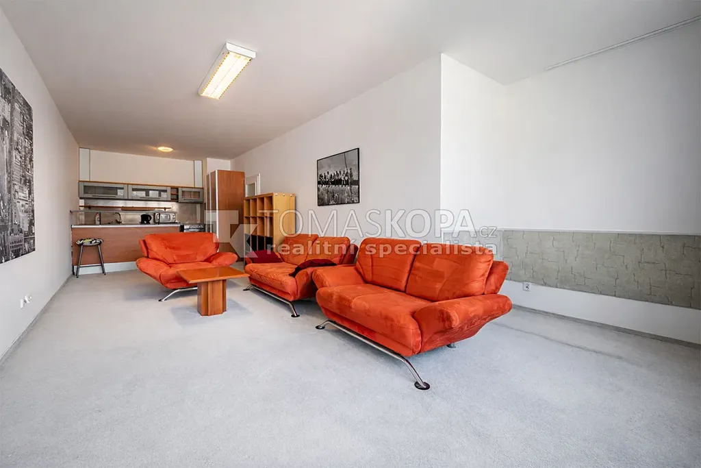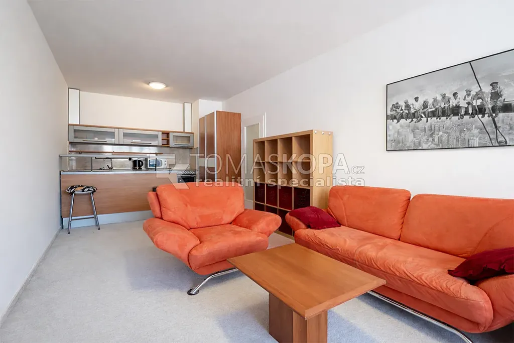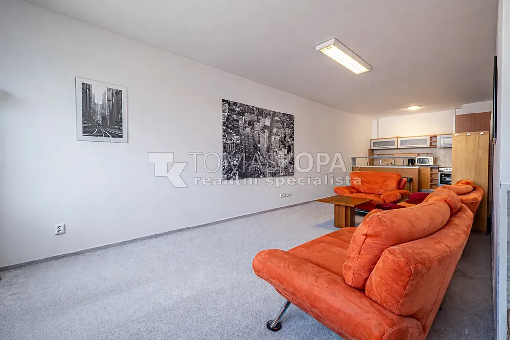 Byt je prakticky řešený a sestává z prostorného obývacího pokoje s kuchyňským koutem (33,9 m²), který poskytuje dostatek prostoru pro pohodlné bydlení i pracovní zónu. Kuchyňský kout je vybaven varnou deskou, sporákem, mikrovlnnou troubou a menší lednicí.