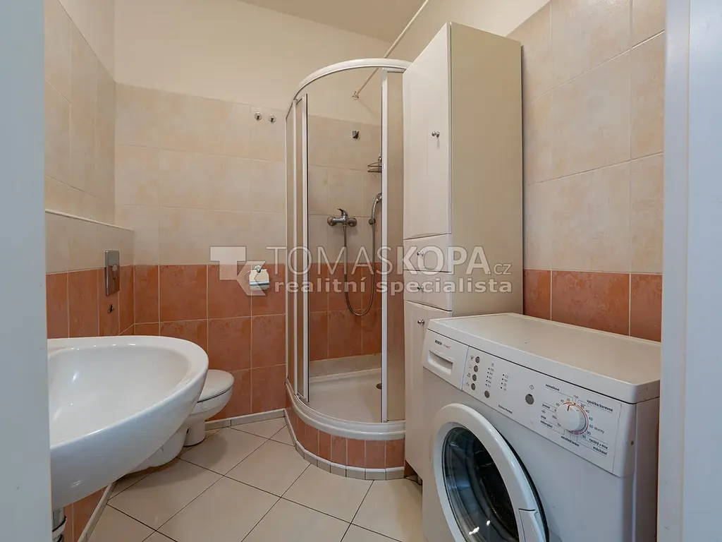Součástí bytu je také předsíň (2,9 m²) a koupelna s WC (3,1 m²) se sprchovým koutem a pračkou. Vytápění je centrální. Aktuální vybavení bytu odpovídá fotografiím uvedeným v inzerátu.
