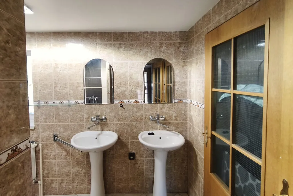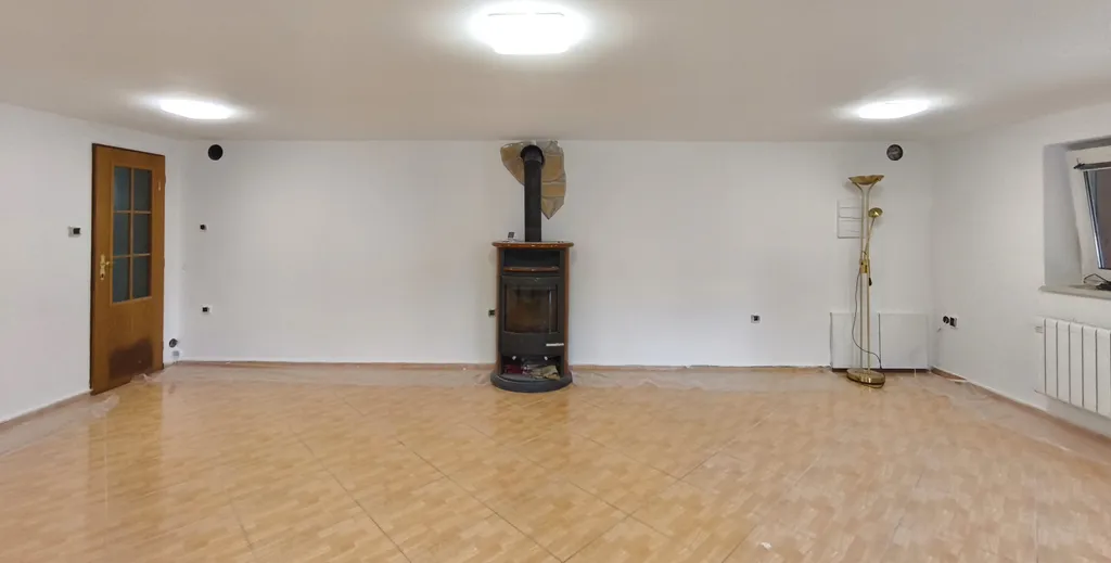 1. přízemí: prostorný obývací pokoj s krbem (37m²) a vstupem na pergolu, kompletně vybavenou kuchyní (13m²), technická místnost, kde se nachází plynový kotel a bojler pro ohřev vody (3,5m²), koupelna se sprchovým koutem (12m²), předsíň (5m²).