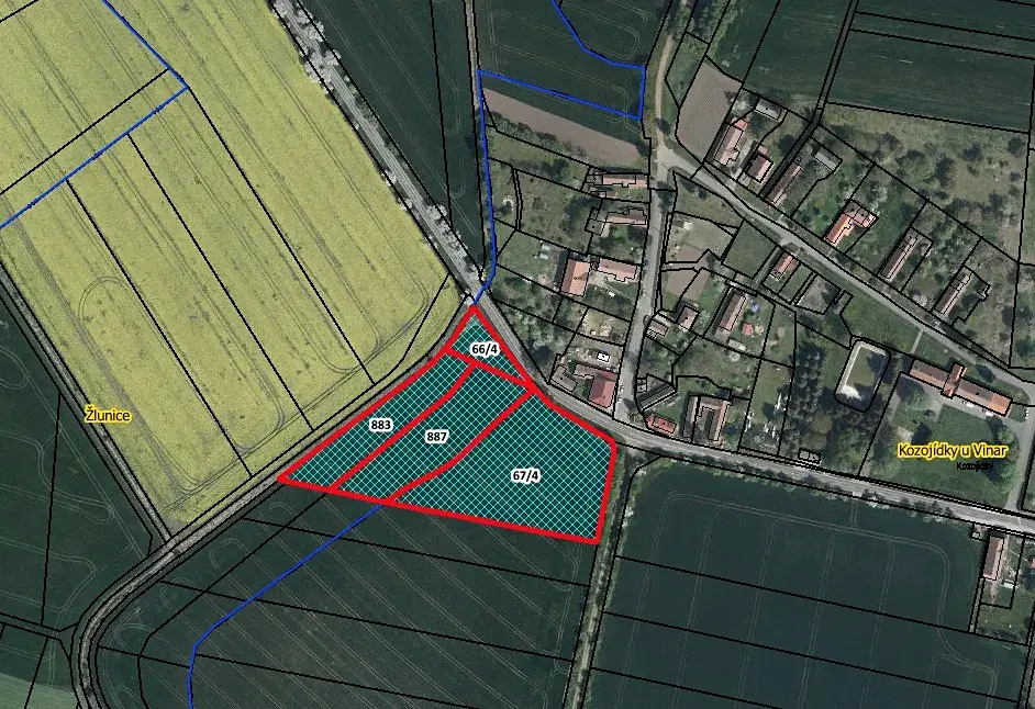 Exkluzivně nabízíme k prodeji soubor pozemků p.č. 66/4 a 67/4 v k.ú. Kozojídky u Vinar, vedené na LV 133 ve výlučném vlastnictví (1/1) a p.č. 883 a 887 v k.ú. Žlunice, vedené na LV 136 ve výlučném vlastnictví (1/1) o celkové výměře 12 959. Na pozemky je přímý přístup ze silnice. Jsou řádně obhospodařovány místním zemědělcem. Na pozemcích je možné hospodařit, případně je v budoucnu směnit se Státním pozemkovým úřadem (SPÚ). V neposlední řadě jsou tyto pozemky díky svému umístění a velikosti s skvělou investiční příležitostí do budoucna.