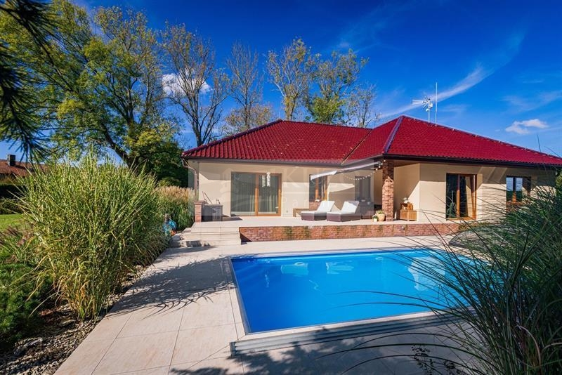 Exklusivně vám nabízíme novostavbu rodinného domu z r. 2017 - bungalov o dispozici 5+kk, se zahradou v klidné části malé obce Koprník, vzdálené 10 km od města Mladá Boleslav. Umístění domu je na úplném okraji obce bez sousedů. Dominantou této nabídky je pozemek o velikosti 2.485 m2 ( včetně domu 2.769 m2) se vzrostlou zahradou, zajišťující naprostý pocit soukromí a příjemné relaxace s letním posezením a místem pro grilování. Vedle terasy domu je umístěn zastřešený bazén se slanou vodou 6 x 3,5 m2 a vlastním tepelným čerpadlem.