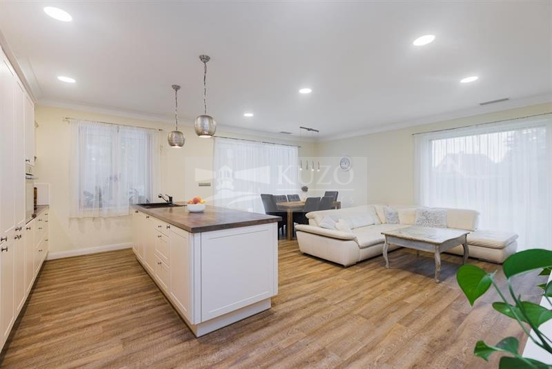 Dispozice domu: vstupní chodba, vestavěná skříň, WC se sprchovým koutem. Po pravé straně zádveří je ložnice s prostornou šatnou. Dále vstupujeme do obývacího prostoru s plně vybavenou kuchyní zn. Trachea, z obývacího pokoje je vstup na terasu do čisté přírody plné klidu a pohodlí bez sousedu. Další tři pokoje jsou samostatně přístupné z chodby, z nichž jeden má vstup také na terasu. Na chodbě k pokojům je umístěna velká vestavěná skříň, dále je zde vstup do druhé koupelny s vanou, pračkou a sušičkou, dále druhé samostatné WC. Dům má dvojgaráž se samostatným vstupem, s automatickým ovládáním garážových vrat.
