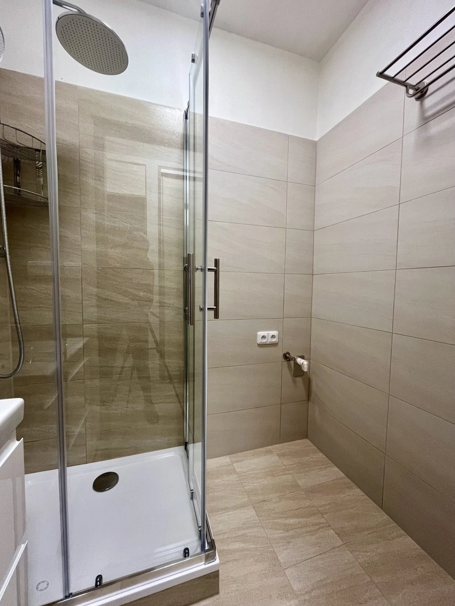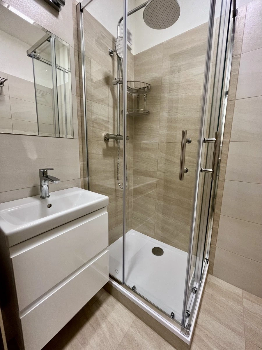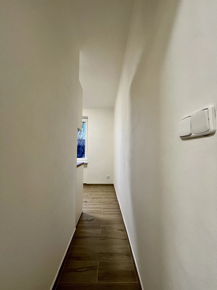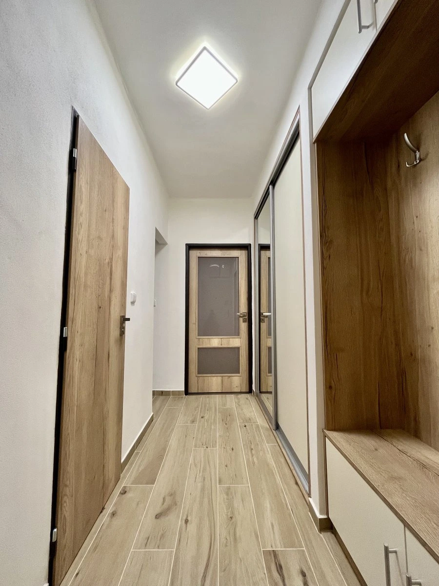 Moderně zrekonstruovaný byt nabízí dva neprůchozí pokoje, do kterých vstupujeme z jednoho průchozího pokoje. Z prostorné chodby s vestvěnými šatními skříněmi se dotaneme na toaletu, která je umístěna samostatně a koupelnu, která nabízí sprchový kout a místo pro pračku a sušičku.
