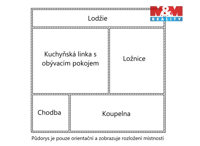 Dispozici tvoří obývací pokoj s kuchyňským koutem, samostatná ložnice a koupelna s vanou a toaletou. Byt je vybaven kuchyňskou linkou se spotřebiči.