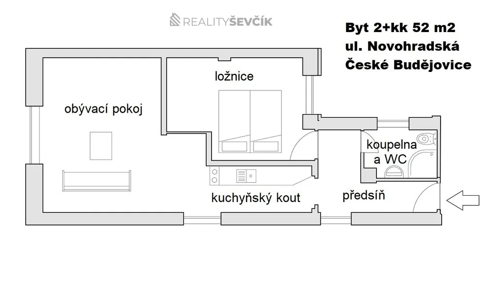 Nabízíme k pronájmu světlý a kompletně vybavený byt o dispozici 2+kk a celkové ploše 52 m², který se nachází v 1. patře nově zrekonstruovaného domu v centru Českých Budějovic, v ulici Novohradská.
