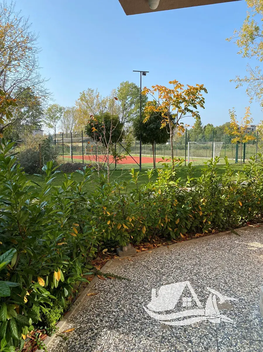 Upravené zahrady, tenisový kurt a fotbalové hřiště v přilehlém parku