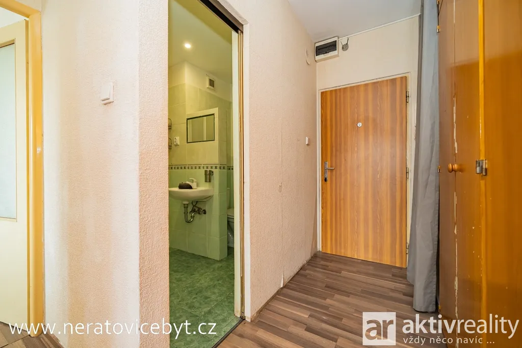 Po vstupu se nachází chodba s vestavěnou šatní skříní, která nabízí dostatek úložného prostoru. Z chodby je vstup do koupelny se sprchovým koutem a toaletou. Dále je zde samostatný pokoj s chytrým řešením vestavěné skříně, která zároveň slouží jako dveře do místnosti a šetří tak prostor. Hlavní obytnou část tvoří obývací pokoj se vstupem na lodžii, která příjemně rozšiřuje obytný prostor. Na obývací pokoj navazuje kuchyně. K bytu náleží také komora umístěná na chodbě domu a sklepní kóje.
