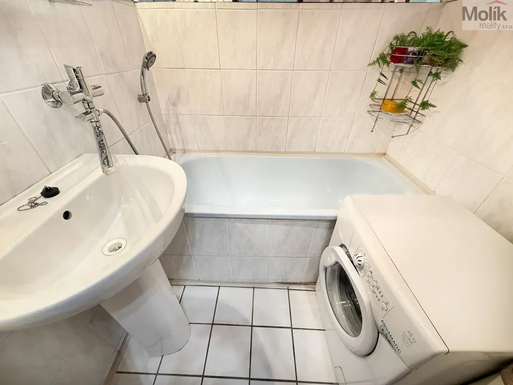 Byt je v pěkném udržovaném stavu - kuchyňská linka se sporákem, koupelna obložená keramickým obkladem s vanou, zařízeno nábytkem, který v bytě zůstává k užívání.