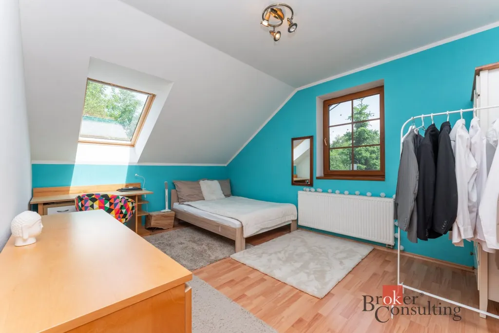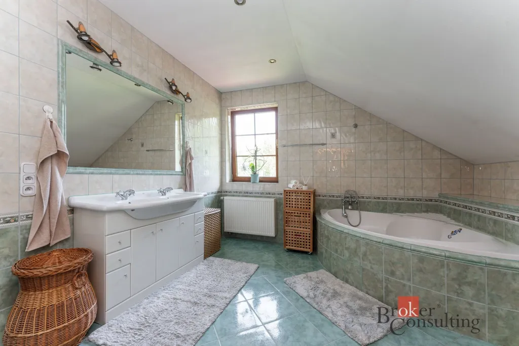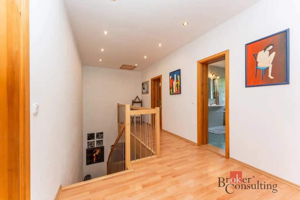 V 1. patře se dále nachází ložnice s šatnou (26,68 m² + 14,53 m²) a výhledem do zelené krajiny. Součástí 1. patra je dále chodba (11,68 m²), pokoj (24,56 m²), koupelna s toaletou (13,62 m²) a dětský pokoj (19,01 m²). Nad obytnou částí se nachází půdní prostor.