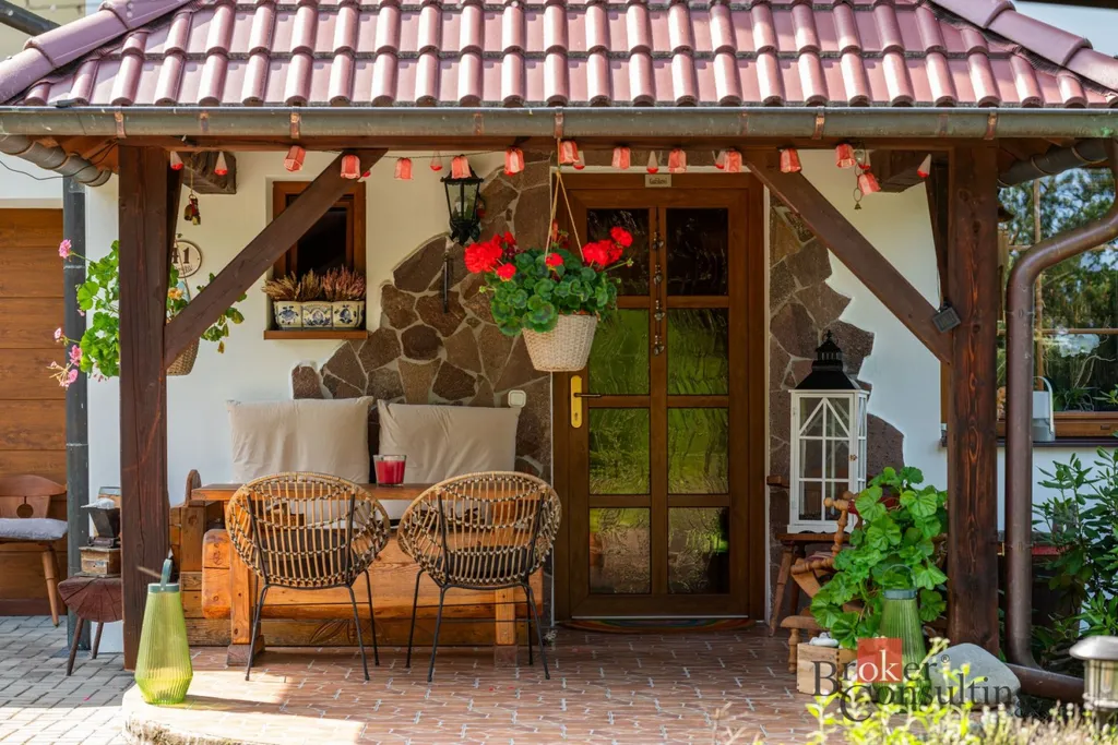 Dům obklopuje vzrostlá zeleň, která poskytuje vysokou míru soukromí. Součástí zahrady je útulná terasa s posezením a grilem, přístřešek pro parkování dvou aut a jezírko s molem.