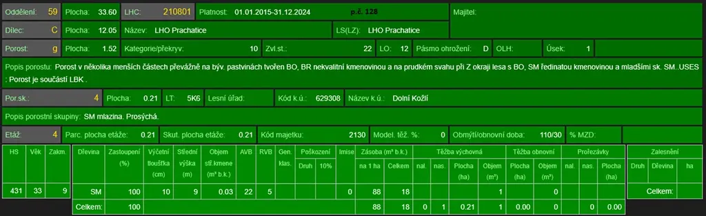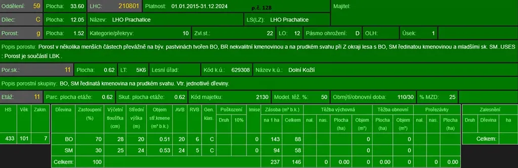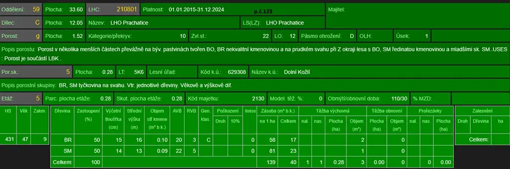 - p.č. 128 vedená jako lesní pozemek o celkové výměře 11 299 m2, vlastníme podíl 2/12 tedy 1 884 m2 (stáří lesa 111 let - zastoupení dřevin borovice, smrk, stáří lesa 57let - zastoupení dřevin bříza, smrk a stáří lesa 43let - zastoupení dřevin smrk)