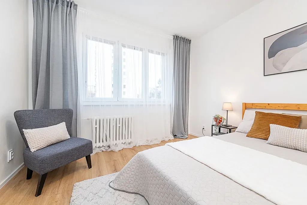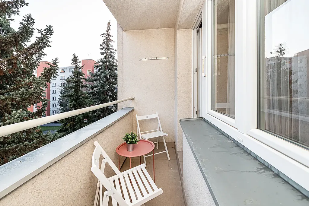 Dispozici bytu tvoří dvě neprůchozí ložnice, velkorysý obývací pokoj spojený s kuchyní, prostorná koupelna se sprchovým koutem a samostatný záchod.