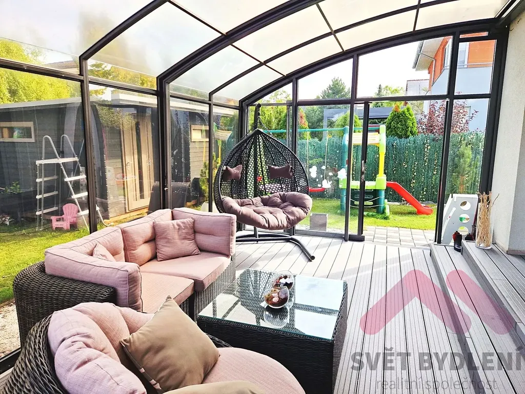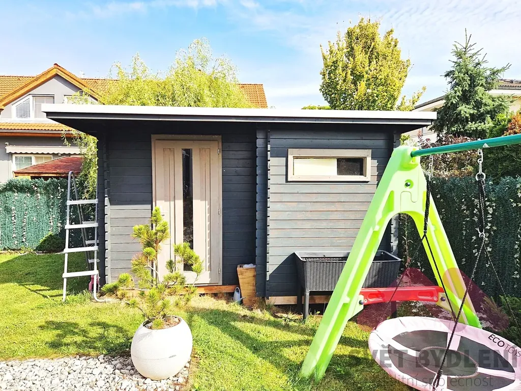 Zimní zahrada s posuvným otevíráním - skvělé místo pro odpočinek, rodinné oslavy nebo posezení s přáteli po celý rok. Velký zahradní domek pro uskladnění nářadí či sportovního vybavení. Zděný nadzemní bazén ( průměr bazenu je 3,9m2) pro letní osvěžení. Možnost ponechání herních prvků pro děti (houpačky, skluzavky apod.). Parkování pro dvě auta - jedno stání na pozemku a jedno přímo před domem.