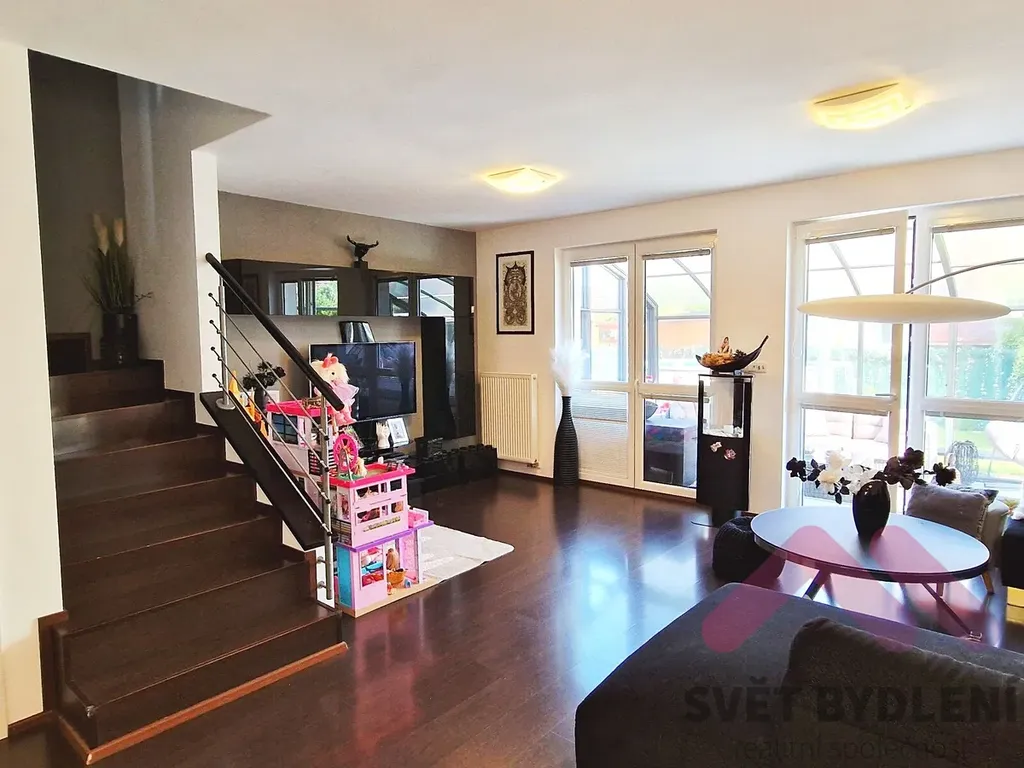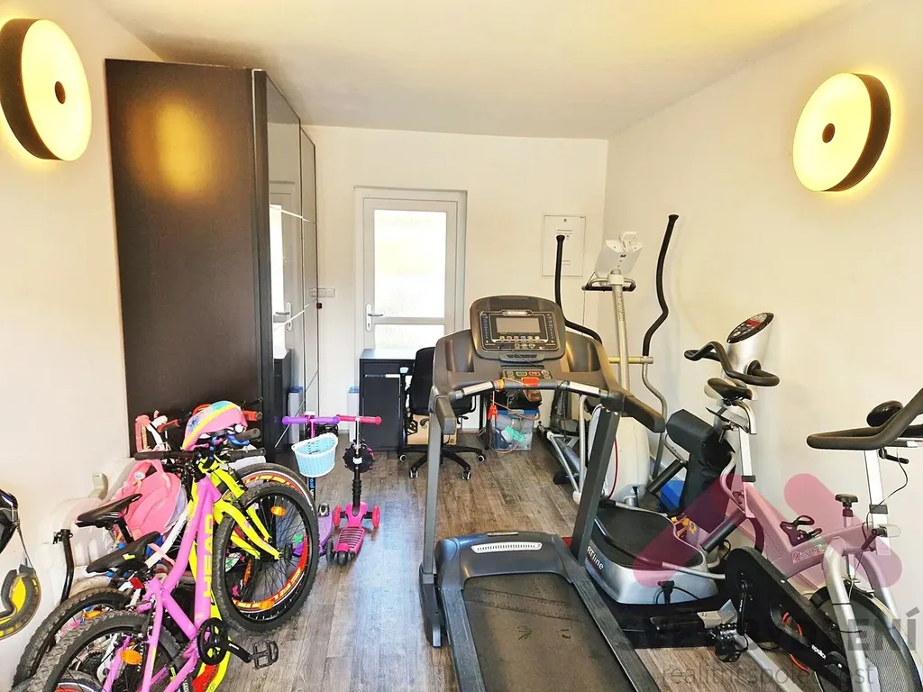 Prostorný obývací pokoj s velkými okny a přímým vstupem do zimní zahrady. Otevřené propojení s moderní kuchyní vytváří příjemný rodinný prostor pro společná setkání. Kuchyňská linka je vybavena kvalitními spotřebiči a množstvím úložného prostoru. Technická místnost s úsporným kondenzačním kotlem zajišťujícím vytápění a ohřev vody. Garáž, aktuálně využívaná jako tělocvična a sklad, s možností navrácení do původní funkce.