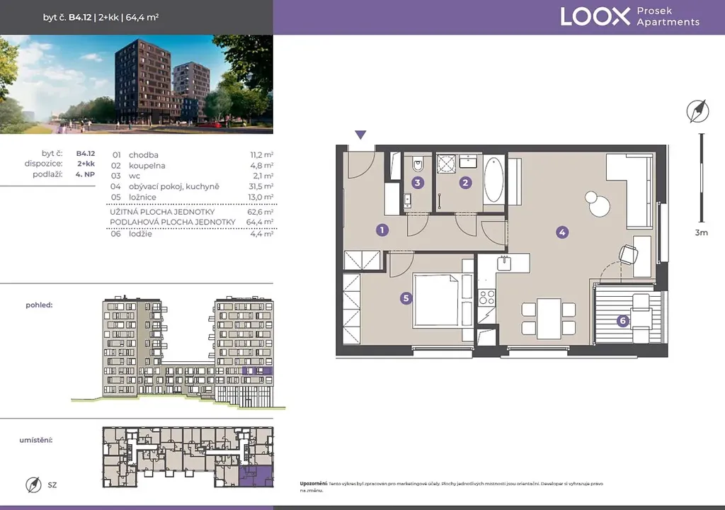 Nabízíme k pronájmu kompletně vybavený byt o dispozici 2+KK s výměrou 64 m2 a lodžií 4,4 m2 ve 4.NP v 11patrovém bytovém domě LOOX přímo u metra Prosek.