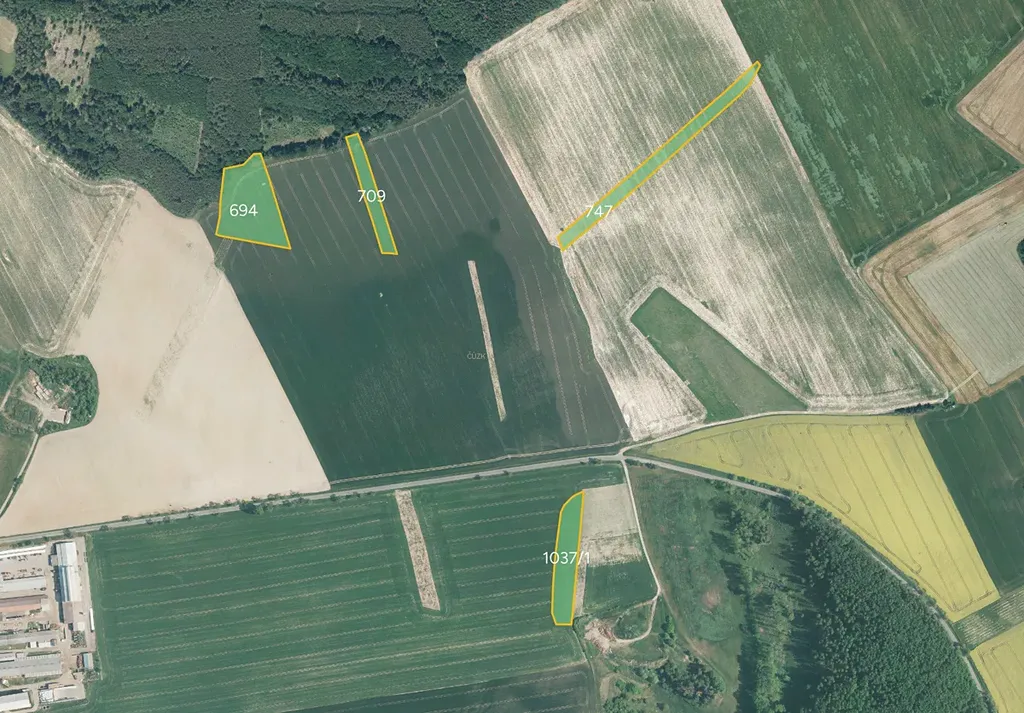 Předmětem prodeje jsou parcely č. 694, 709, 747 a 1037/1, zapsané na LV 557. Pozemky mají společnou výměru 21 382 m². K prodeji je majoritní vlastnictví - 16 036 m². Celá plocha je vedena jako orná půda.