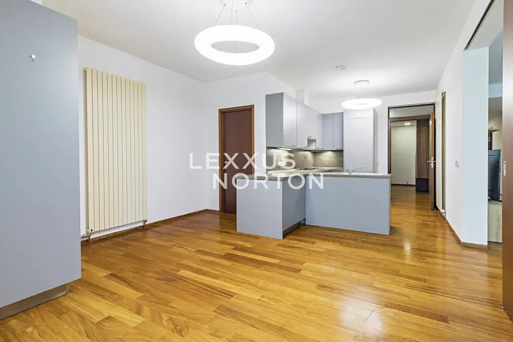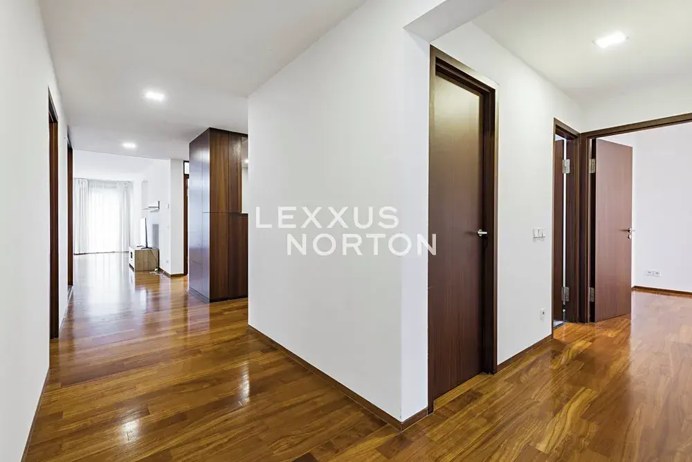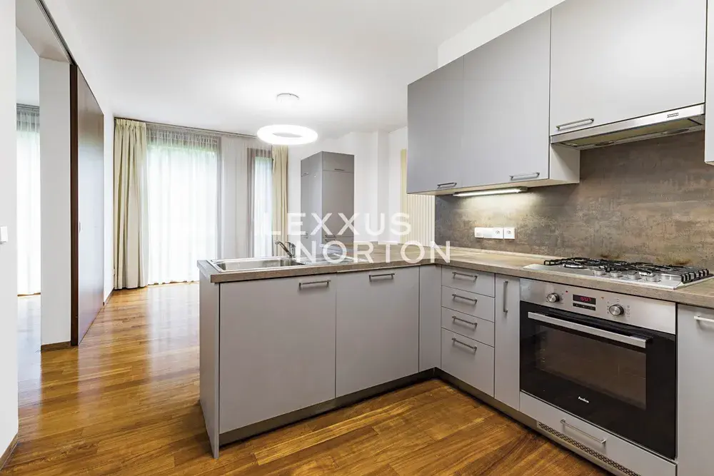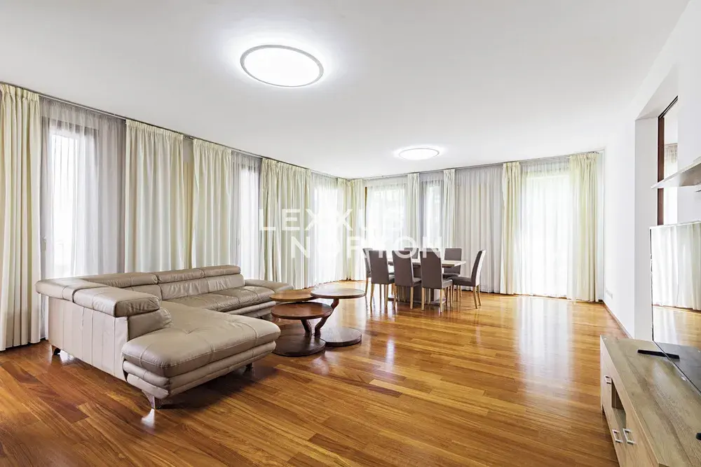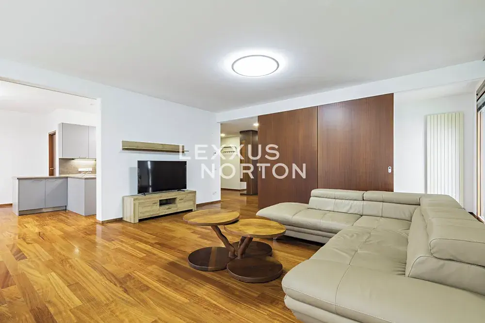 Tento byt se nachází v 1. NP bytového komplexu s výtahem a 24 hodinovou recepcí. Designový interiér bytu je tvořen vstupní halou, vzdušným obývacím pokojem s velkorysými okny, jídelním koutem a samostatnou kuchyní, 4 ložnice, 2 koupelny, samostatná toaleta a 2 komory. K bytu náleží 2 garážová parkovací stání.