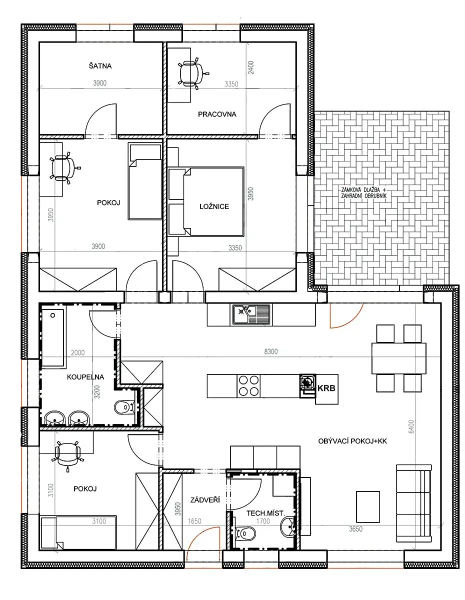 Dispozice 5+kk (106 m²): Ideální řešení pro početnou rodinu se čtyřmi ložnicemi a velkým obývacím pokojem.
