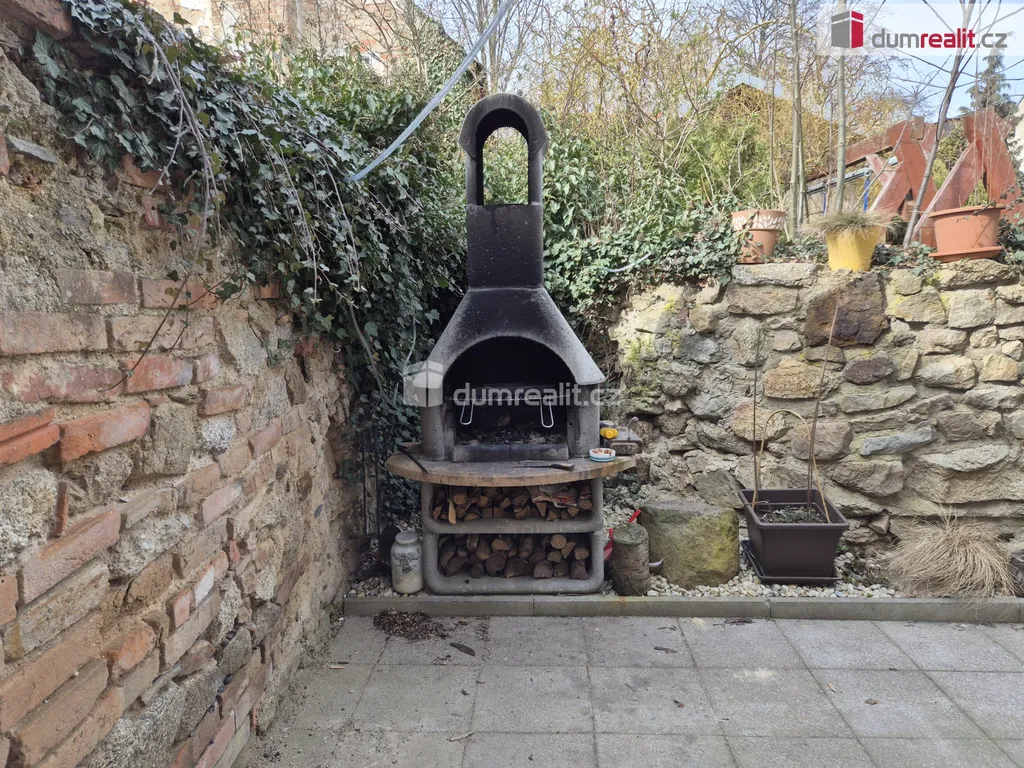 Příjemně lze posedět na oplocené předzahrádce na východní straně směrem k návsi a pak i za domem "na dvorku" s krbem, kde je přístup také do sklepa.
