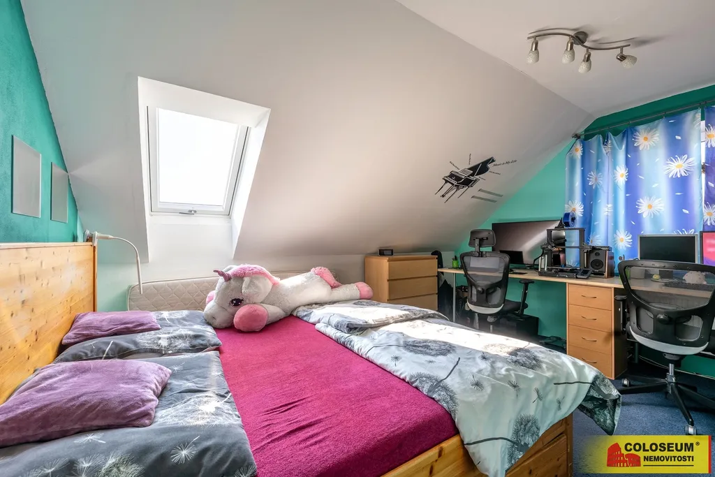 Dispozice nabízí pět samostatných pokojů, které lze využít například pro až tři děti nebo jako kombinaci ložnice a pracovny, a dvě koupelny s WC. V přízemí se nachází koupelna se sprchovým koutem, v patře je druhá koupelna s vanou.