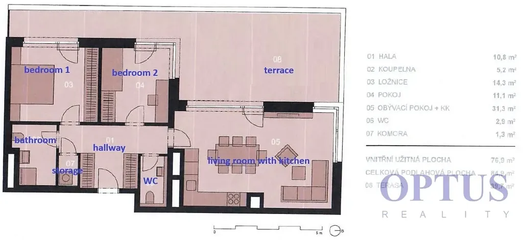 Byt zahrnuje prostorný obývací pokoj s kuchyňským koutem o výměře 31,3 m2 a se vstupem na terasu, dvě ložnice (14,3 m2 a 11,3 m2) rovněž se vstupem na terasu, koupelna se sprchovým koutem a WC, samostatné WC s bidetovou sprškou, komora a vstupní hala.