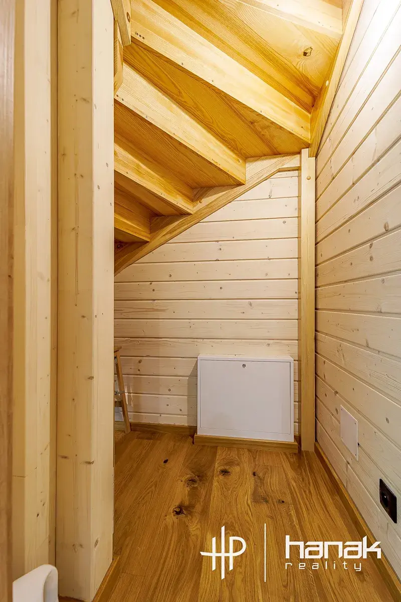 V přízemí nemovitosti se nachází zádveří, koupelna, obývací pokoj s kuchyňským koutem s výstupem na zastřešenou terasu s pergolou. Po schodišti z jasanového masivu, pod nímž je zbudována spíž, se dostaneme do podkroví se třemi místnostmi a toaletou.