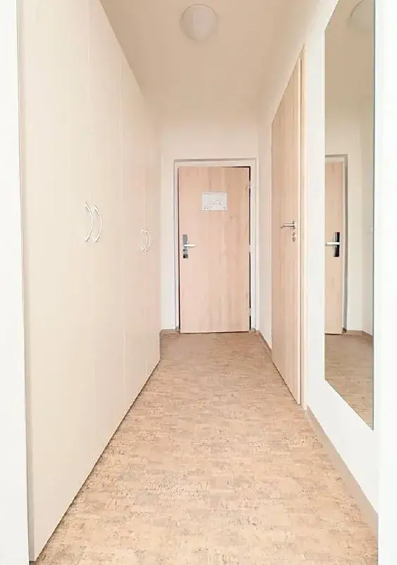 Byt je světlý a prakticky řešený, připravený k okamžitému nastěhování bez nutnosti dalších úprav. Obytný prostor je vybaven moderní kuchyňskou linkou se spotřebiči (lednice, varná deska), a také budete mít psací stůl. Koupelna nabízí sprchový kout a toaletu. Interiér působí čistým a nadčasovým dojmem.