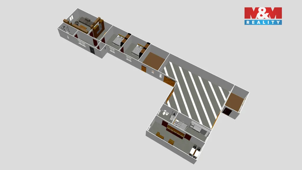 Dům je jednopodlažní, smíšené konstrukce, s dispozicí 3+1 a samostatným vejmin­kem 2+kk, který je vhodný pro vícegenerační bydlení, hosty nebo pronájem. Součástí nemovitosti je také stodola a bývalé chlévy, které rozšiřují možnosti využití – například pro dílnu, skladování nebo hospodaření.