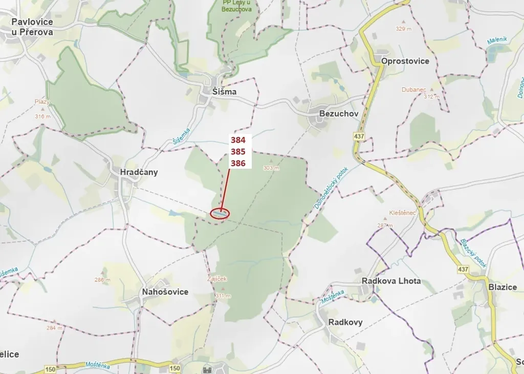 Lesní pozemky o výměře 3483 m2, parcelní čísla 384, 385, 386, podíl 1/1, katastrální území Hradčany na Moravě, obec Hradčany, obec s rozšířenou působností Přerov, okres Přerov, Olomoucký kraj. Po těžbě.