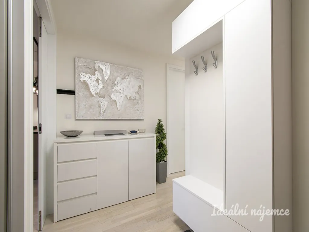 Byt se nabízí plně vybaven. Podsvícená a moderní kuchyně na míru disponuje americkou lednicí s výrobníkem ledu, myčkou, elektrickou troubou, mikrovlnou troubou, indukční varná deskou, digestoří a jídelním stolem s židlemi. Prostorná obývací část je zařízená luxusní sedací soupravou, konferenčním stolkem , obývací stěnou a TV. V ložnici najdeme velkou šatní skříň, noční stolky, TV, police a šatní místnost. Druhý pokoj disponuje velkou šatní skříní se zrcadlem, policemi, sedačkou, pracovním stolem s židlí.