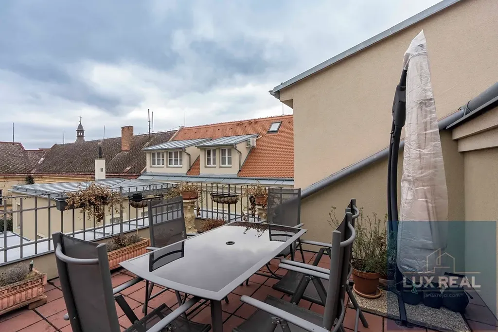 Penthouse se nachází jako jediný v třetím patře budovy, čímž nabízí krásný výhled na město. Jeho výraznou součástí je také střešní terasa o rozměrech 36m2, která je ideálním místem pro odpočinek, posezení s přáteli nebo třeba večerní grilování. Umožňuje krásné výhledy na zámek i Svatý kopeček.