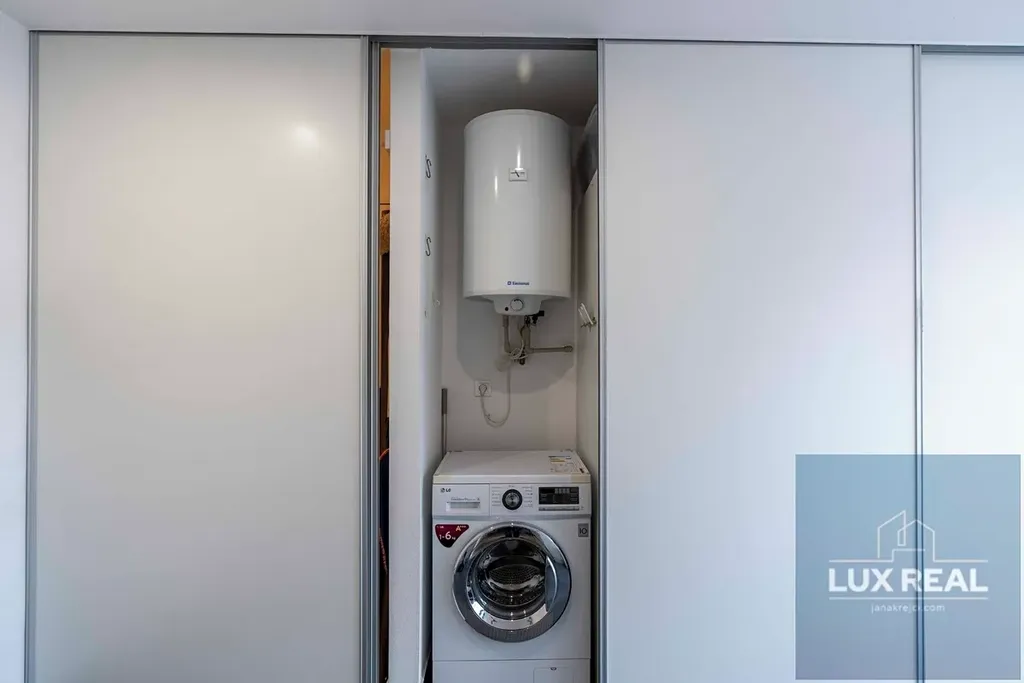 Vstupní chodba s vestavěnými skříněmi, které zároveň slouží i jako dveře oddělující chodbu od koupelny (sprchový kout, samostatně stojící vana, a oddělená toaleta), ale i od obytného otevřeného prostoru. Z této vstupní chodby se dostane také přímo na terasu.