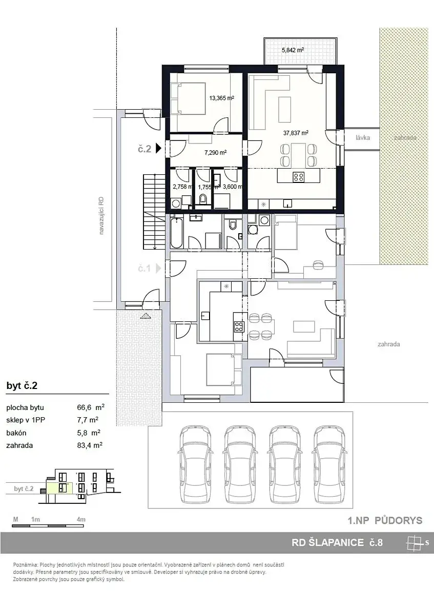 Dispozice: chodba 7,29m2, obývací pokoj s kuchyňským koutem 37,83m2 s přímým vstupem přes lávku na zahradu 83,4m2 a s balkonem 5,8m2, ložnice 13,36m2, koupelna se sprchovým koutem 3,6m2 a WC zvlášť 1,75m2 a technická místnost 2,75m2.