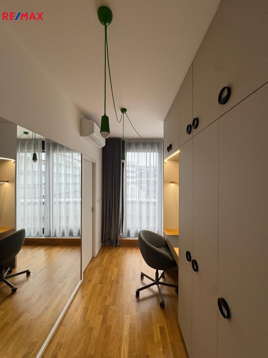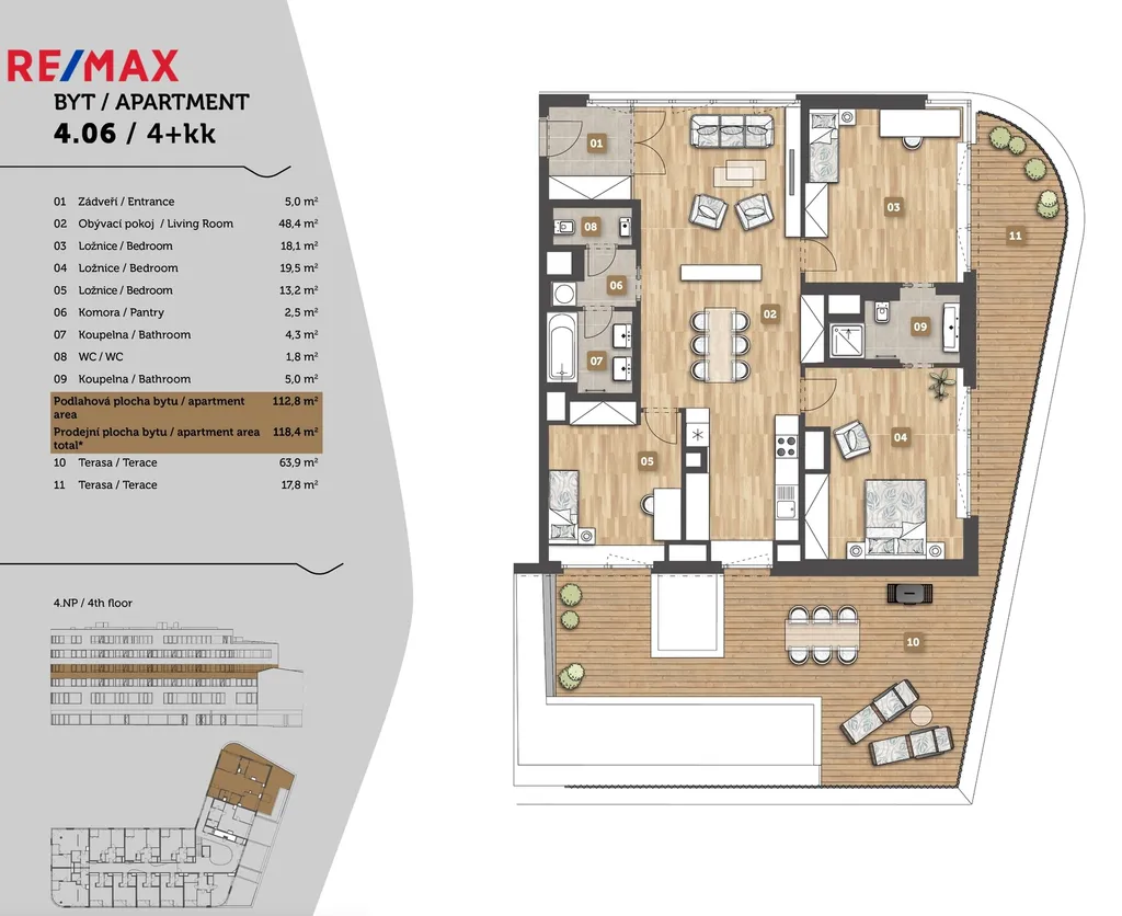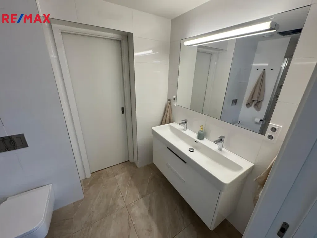 Byt se nachází ve 4.NP polyfunkčního domu. Ze zádveří s vestavěnou skříní se vstupuje do velmi prostorné hlavní místnosti s kuchyní. V bytě je samostatná toaleta s umyvadlem a koupelna s vanou a dvěma umyvadly. Dětský pokoj , ložnice s pracovním koutem , koupelna se sprchou a WC a další dětský pokoj. Ze všech obytných místností je pohodlný výstup na terasu.