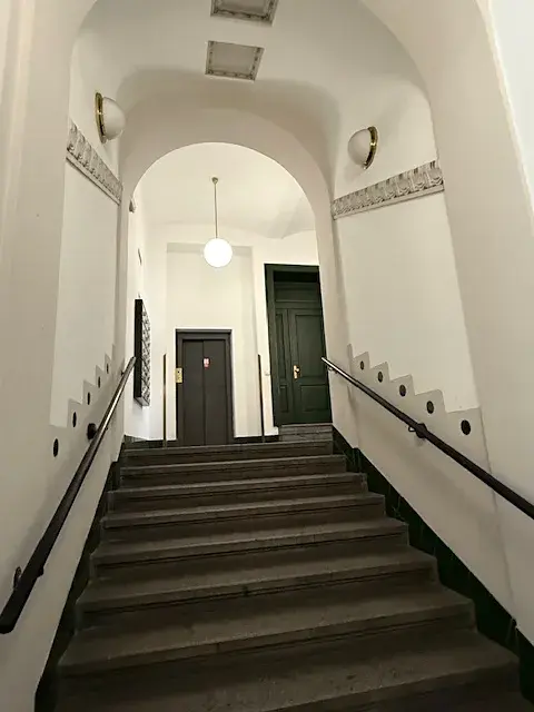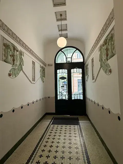Byt se nachází v secesním domě s recepcí, kde je zároveň možnost pronájmu garážového stání přímo v domě,což je v centru města výhodou.