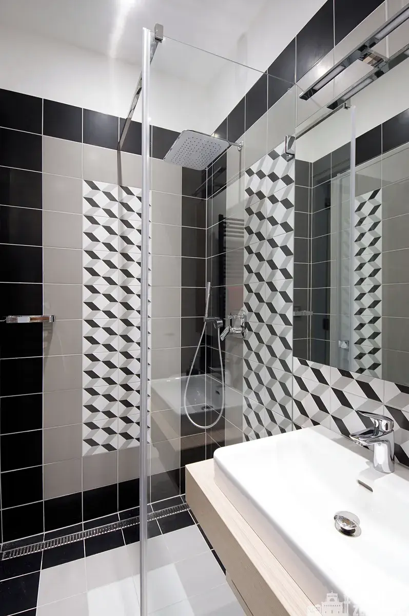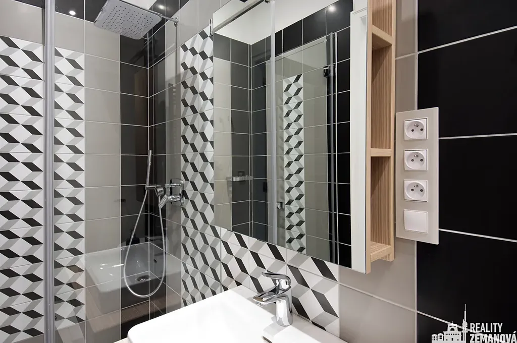Byt je řešen prakticky a působí velmi příjemným, vzdušným dojmem. Při vstupu do předsíně se naproti, za zrcadlovou stěnou, nachází koupelna se sprchovým koutem, umyvadlem, WC a bidetem. Součástí předsíně je také vestavná skříň s technickým zázemím (elektrický kotel, bojler a přípojka na pračku).