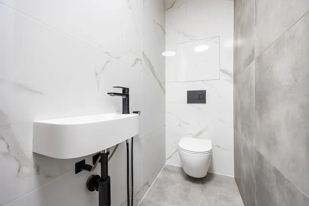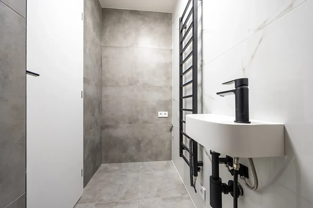 Koupelna je s vanou, sprchovým koutem, podlahovým topením a designovým umyvadlem na praktické skříňce se dvěma zásuvkami. V bytě je samostatná toaleta s vlastním umyvadlem, bidetovou sprchou, topným žebříkem a přípravou na pračku.