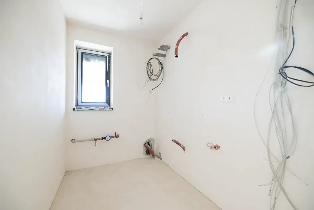 Dům je těsně před kompletním dokončením na klíč vyjma finálního povrchu podlah (vinyl, plovoucí podlaha atd.), obkladů, dlažby a sanity v koupelně a interiérových dveří.