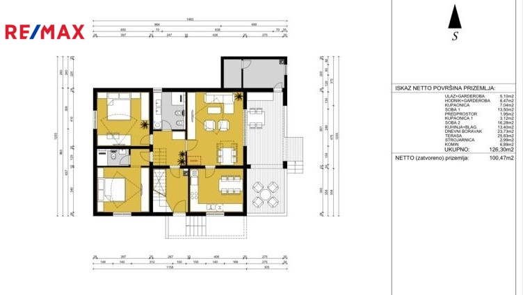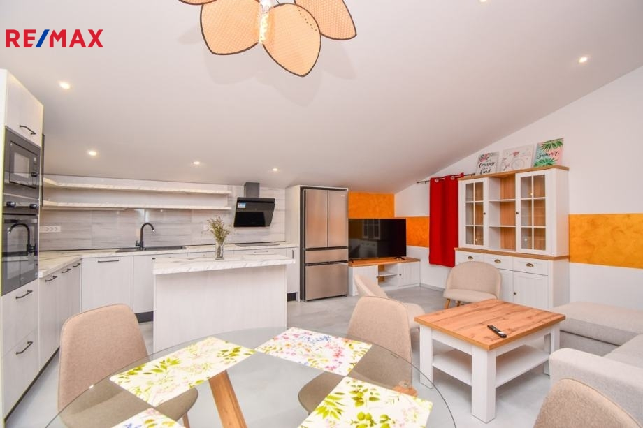 Zařízený samostatně stojící dům s velkou zahradou a bazénem, o rozloze 245 m2 a skládá se z přízemí a horního patra.