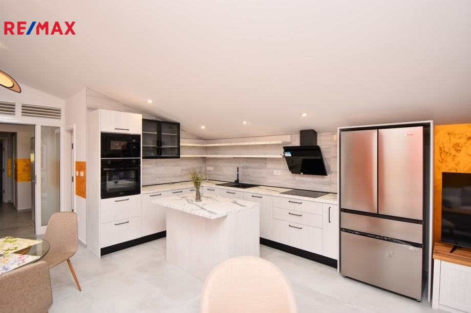 V patře - po vystoupení po vnitřním schodišti se nachází další byt o rozloze 118,55 m2, který se skládá z: chodby s toaletou, 2 ložnic s koupelnou, vstupní haly, pracovny, obrovské kuchyně s jídelnou a obývacího pokoje s přístupem na jižní slunnou terasu.