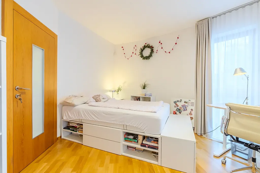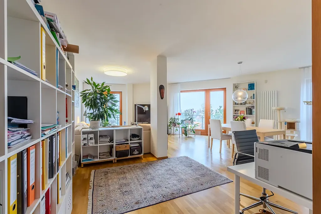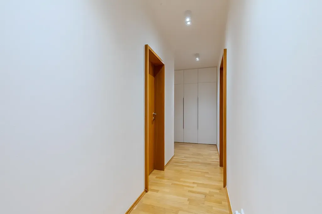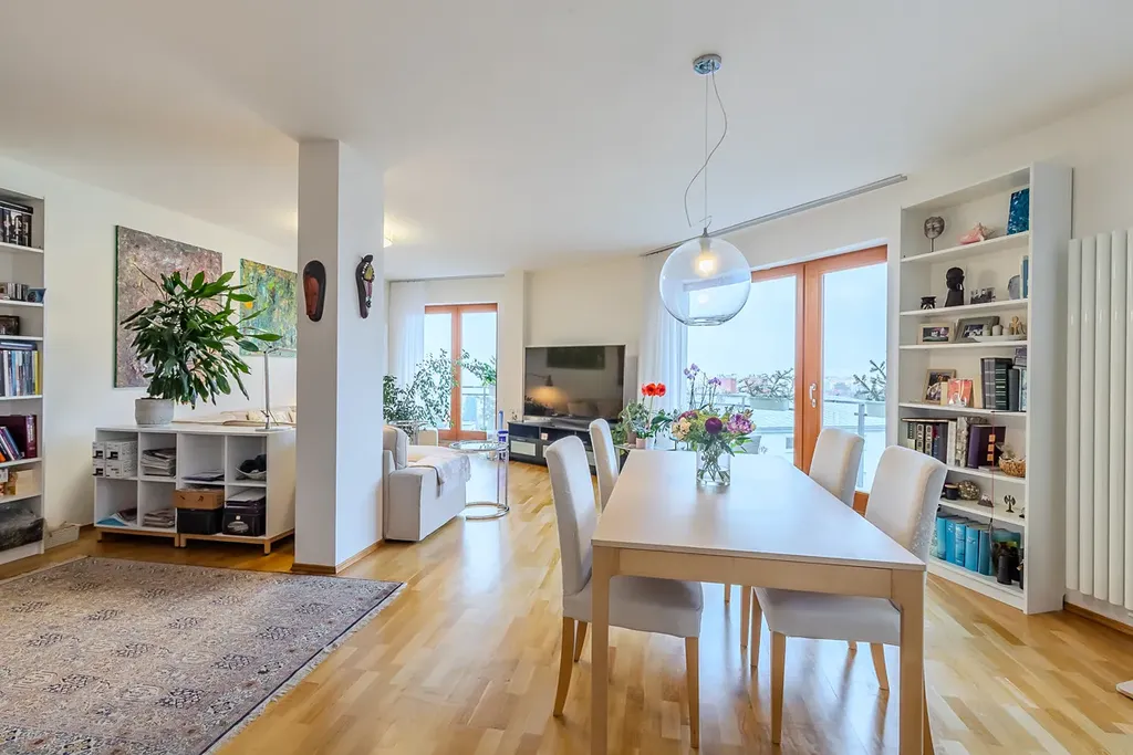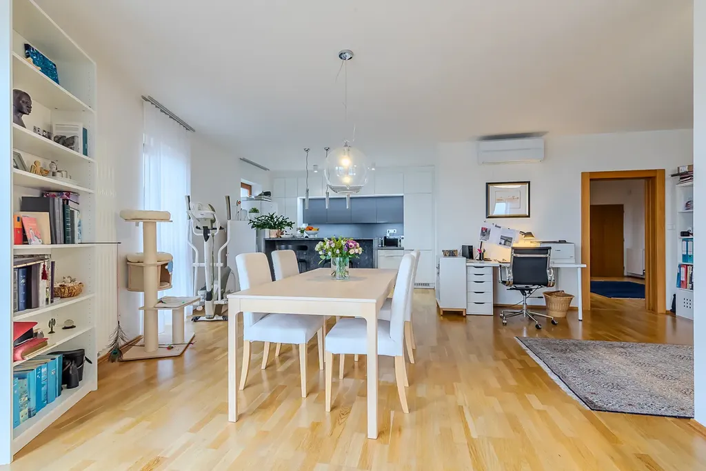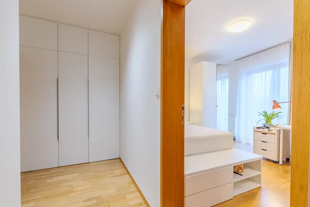 Dominantou bytu je obývací prostor propojený s jídelní částí a plně vybavenou kuchyní s barovým pultem. Díky velkým francouzským oknům je celý interiér krásně prosvětlený a působí velmi vzdušně. Z obývací části je přímý vstup na prostorný balkon, který nabízí příjemné posezení a otevřený výhled do okolní zástavby a zeleně. Hlavní ložnice disponuje vlastní en-suite koupelnou, která zajišťuje maximální komfort a soukromí. Byt dále nabízí další samostatné pokoje vhodné jako ložnice, dětské pokoje či pracovna. Druhá koupelna je vybavena vanou a toaleta je řešena samostatně s bidetem. Praktickým prvkem bytu je také technická místnost s pračkou a sušičkou a dostatek úložných prostor. Standard bytu zahrnuje dřevěné podlahy a kvalitní interiérové dveře.