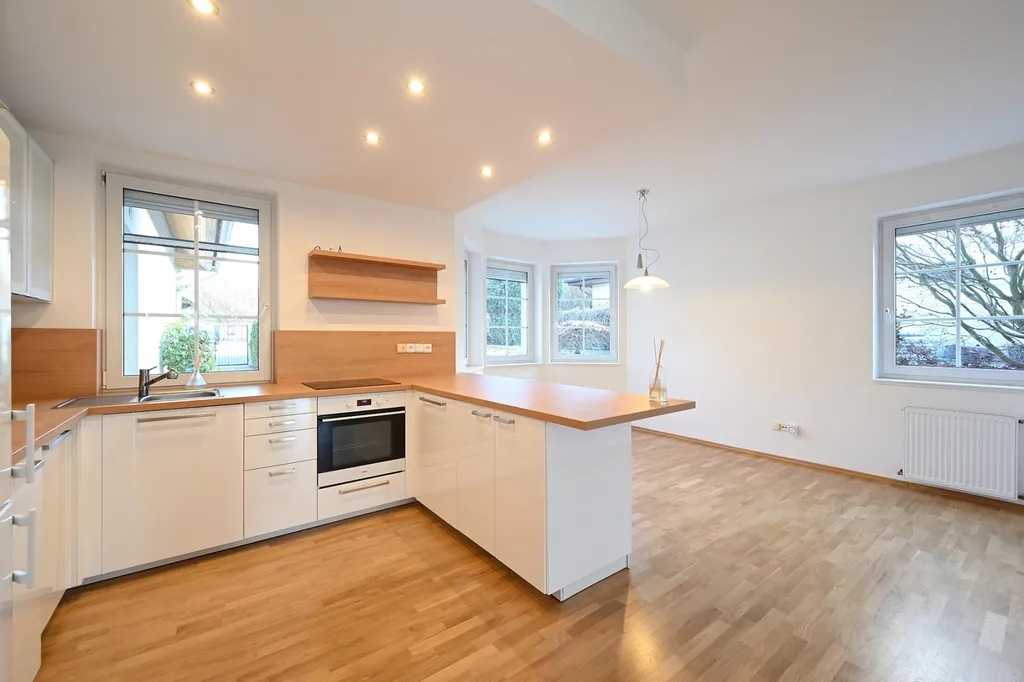 V přízemí domu velkorysý obývací pokoj (43m2) s krbem a přímým vstupem přes terasu do nádherné vzrostlé zahrady. Plně zařízená kuchyň moderními spotřebiči a přilehlou komorou, navazující prosvětlená jídelna. Pokoj pro hosty (21m2) s vestavěnými skříněmi, koupelna se sprchovým koutem a toaletou, prostorná technická místnost s oknem.