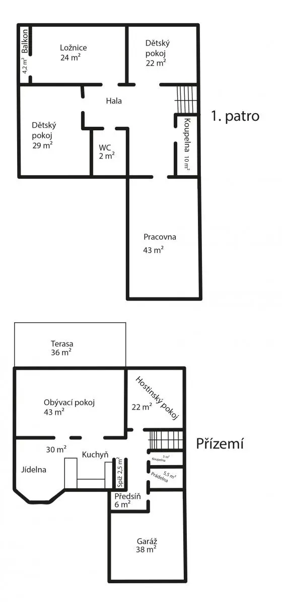 V patře domu tři ložnice: 2 dětské pokoje /pracovny (22, 30 m2) and ložnice rodičů (27m2) s balkonem a vestavěnými skříněmi. Dále prostorná (43m2) podkrovní místnost, vhodná jako domácí kancelář, dětská herna, další ložnice atp. Prosvětlená hlavní koupelna s vanou i sprchovými koutem. Toaleta je umístěna zvlášť.